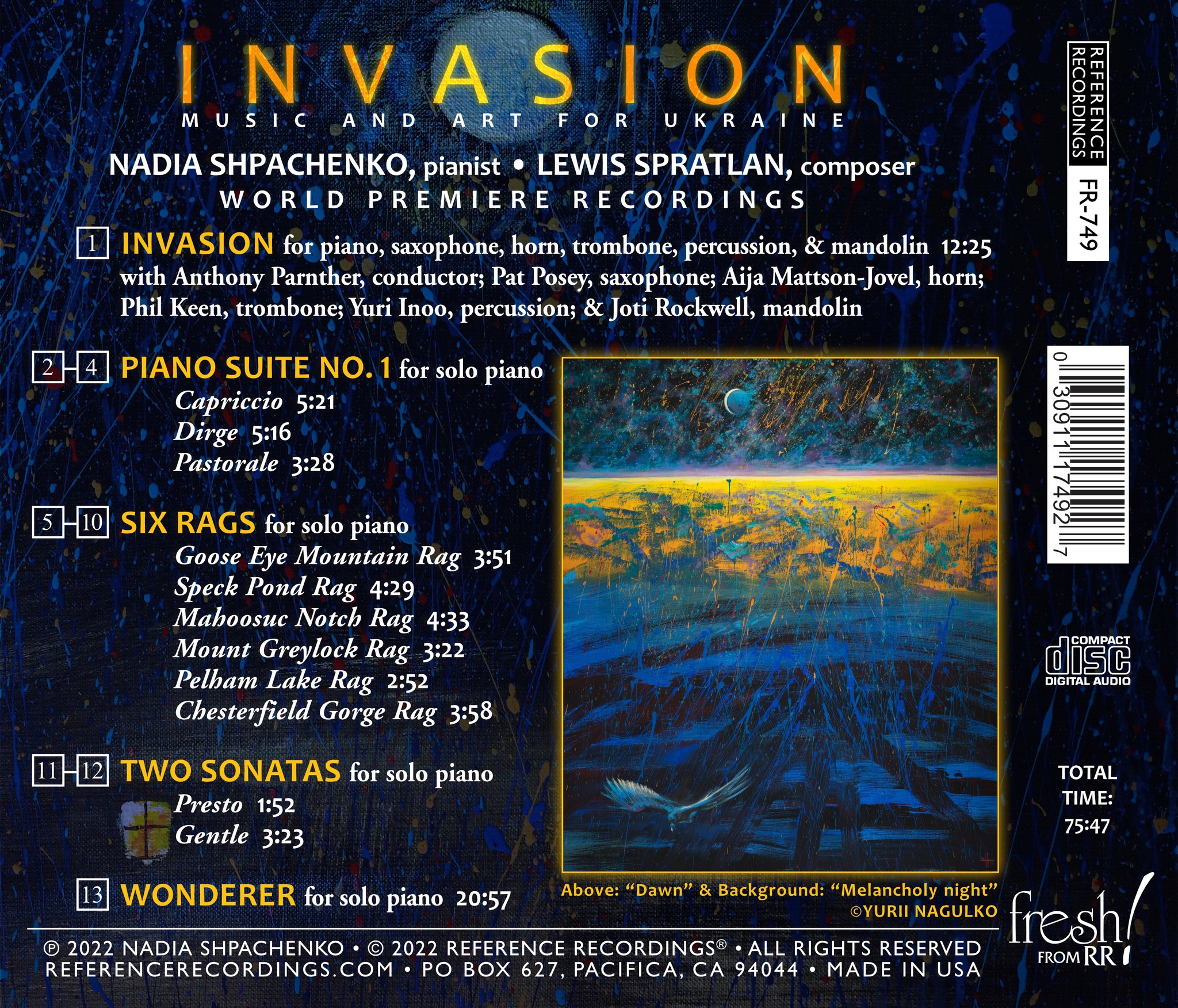 “Watching in horror as my home city of Kharkiv was being destroyed, I resolved to express through music my feelings of despair and anger, as well as hope and resilience. On my birthday in February 2022, the war started, Lewis Spratlan began writing INVASION, and the character of our plan for a CD of his works shifted. Positivity, defiance, perseverance, peace, nostalgia, recollections, and hope – all are displayed by the people in Ukraine, and all are reflected in the pieces on this disc.” — Nadia Shpachenko