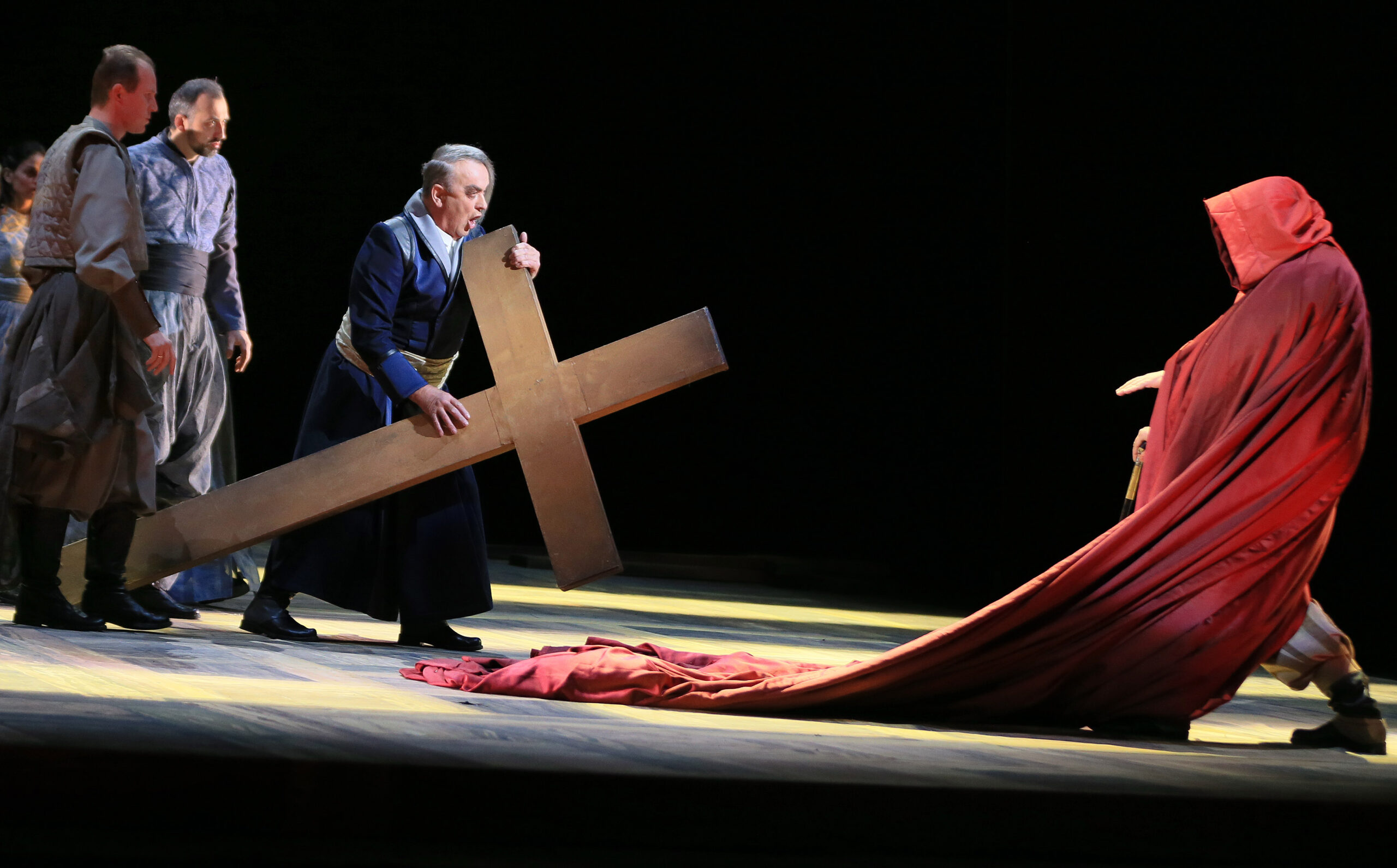Все, як у Гоголя, окрім постаті Судді (Василь Вовкун), відсутньої у літературному першоджерелі, із вуст якого звучить давня бувальщина про названих братів Петра та Івана, українських Каїна та Авеля. Проспіваною сліпцем-бандуристом історією про страшну зраду та не менш страшну помсту, які стали причиною драми, що розгортається в основній частині оповіді, гоголівська повість завершується. Опера ж Станковича із неї розпочинається: кожна із трьох дій дантівськими колами розходиться навколо фрагментів вироку суду людського та суду Божого, які Суддя то буденно зачитує, то мелодекламує у традиції богослужбового співу.
