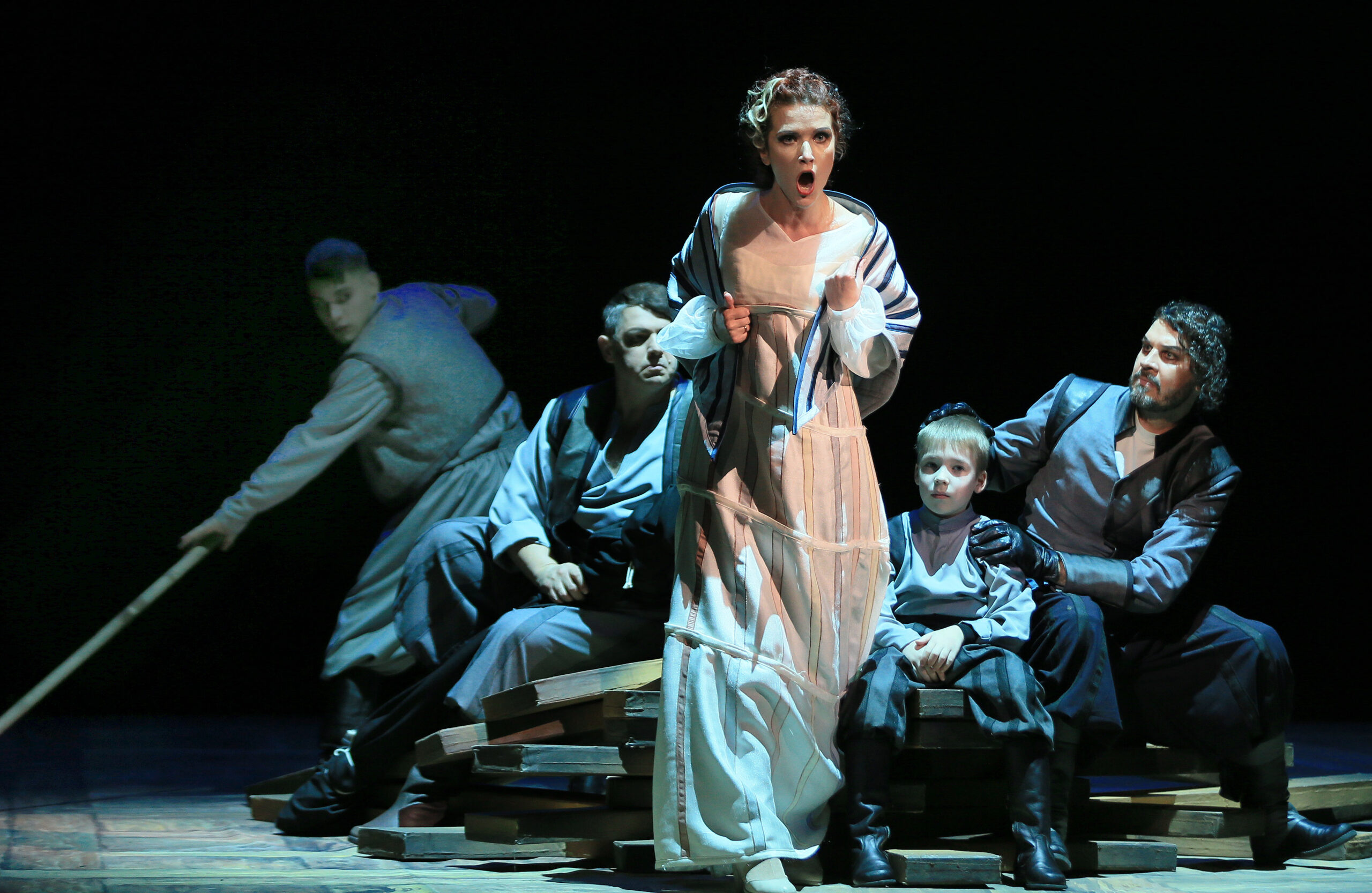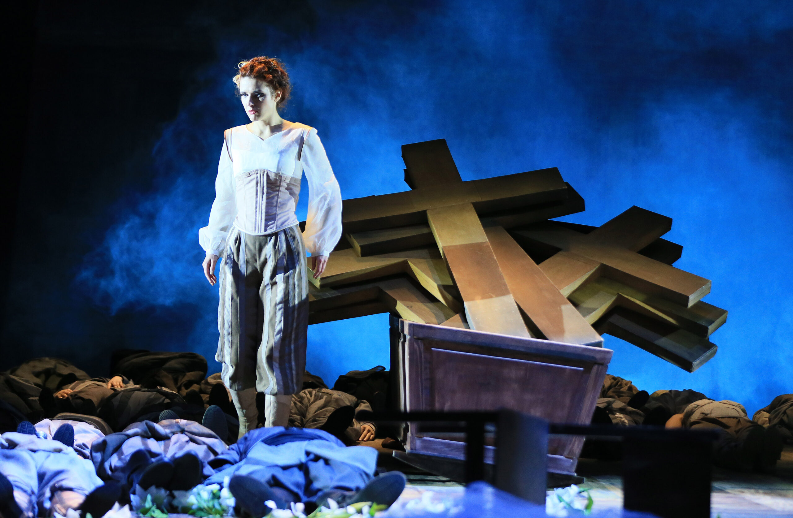 Страшний сон, від якого неможливо прокинутися… Саме таким вже дев’ять місяців є наше життя, і саме через образ сновидіння режисеру Андреасу Вайріху та художниці-постановниці Анні Шеттль вдалося втілили моторошну ірреальність гоголівського сюжету. Зала зустрічає публіку оголеним проваллям сцени: жодної завіси, що мала б сором’язливо ховати сакральне нутро театру від пронирливих поглядів профанів. Втім, перед початком вистави тут, здається, нічого й приховувати: єдиний пронизливий промінь світла (художник світла Олександр Мезенцев) вириває із темряви лише коника — дитячу забавку, необережно покинуту на підлозі сином Катерини, що згодом промайне тінню Вершника, приреченого у пекельному безсмерті спостерігати за довічною карою свого кривдника.