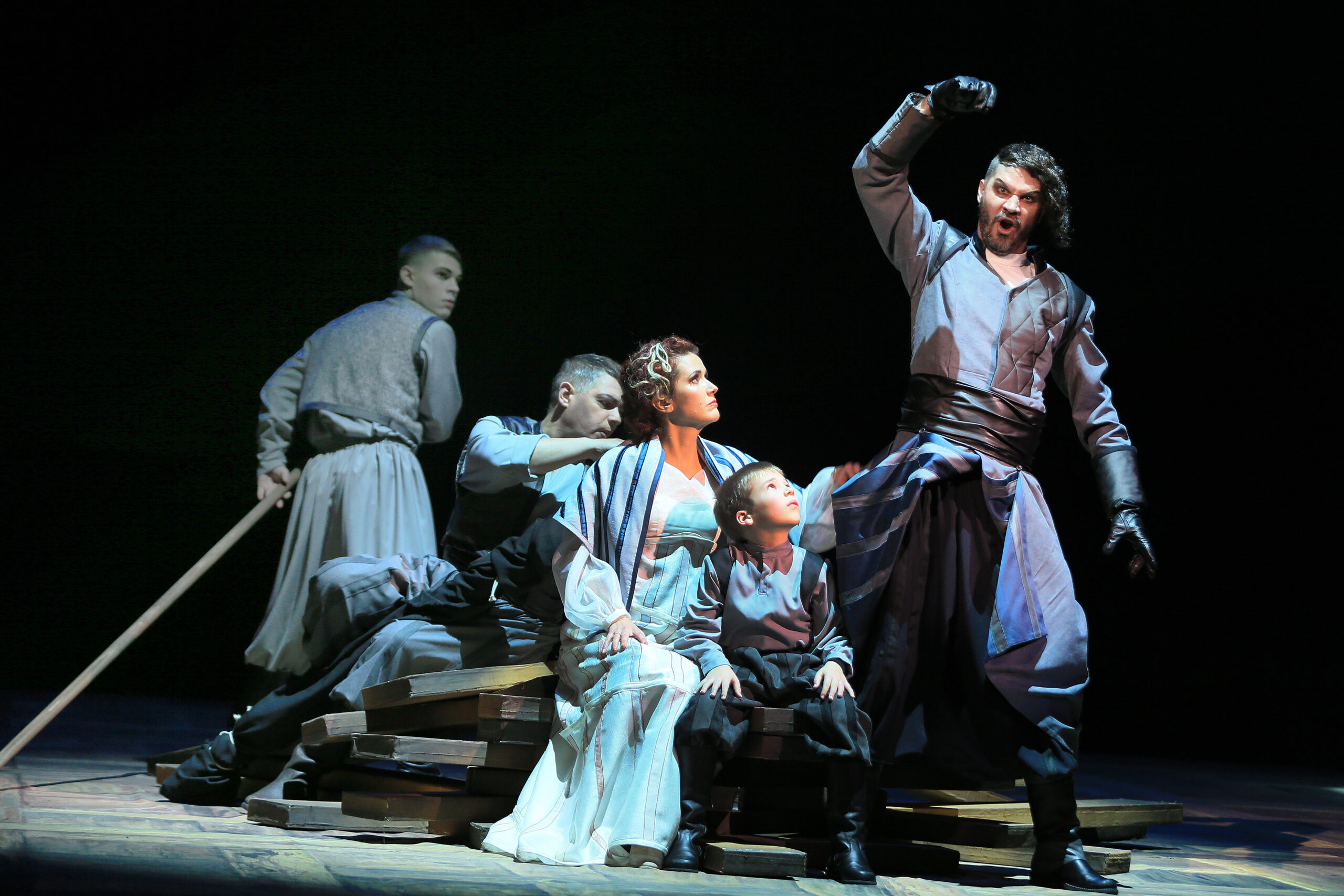 У лаконічному візуальному оформленні вистави немає жодної випадкової деталі, а ось релігійного символізму, що химерно переплівся з прикметами сьогоднішніх реалій, вдосталь. Переважає християнська символіка: тут і чаша причастя, що ніби увібрала в себе весь Дніпро, і натяк на Вавилонську вежу, у якій моя харківська запалена уява розгледіла обриси спалених багатоповерхівок Північної Салтівки, і, звісно, нескінченні та багатофункціональні хрести. Хрестом осавул виганяє Відьмака з весілля, кожен свій хрест несуть задихані мерці, на човні з хрестів родина Данила Бурульбаша мандрує додому, і з цих самих хрестів козаки будують щось на кшталт протитанкових «їжаків», готуючись до прийому незваних гостей.
