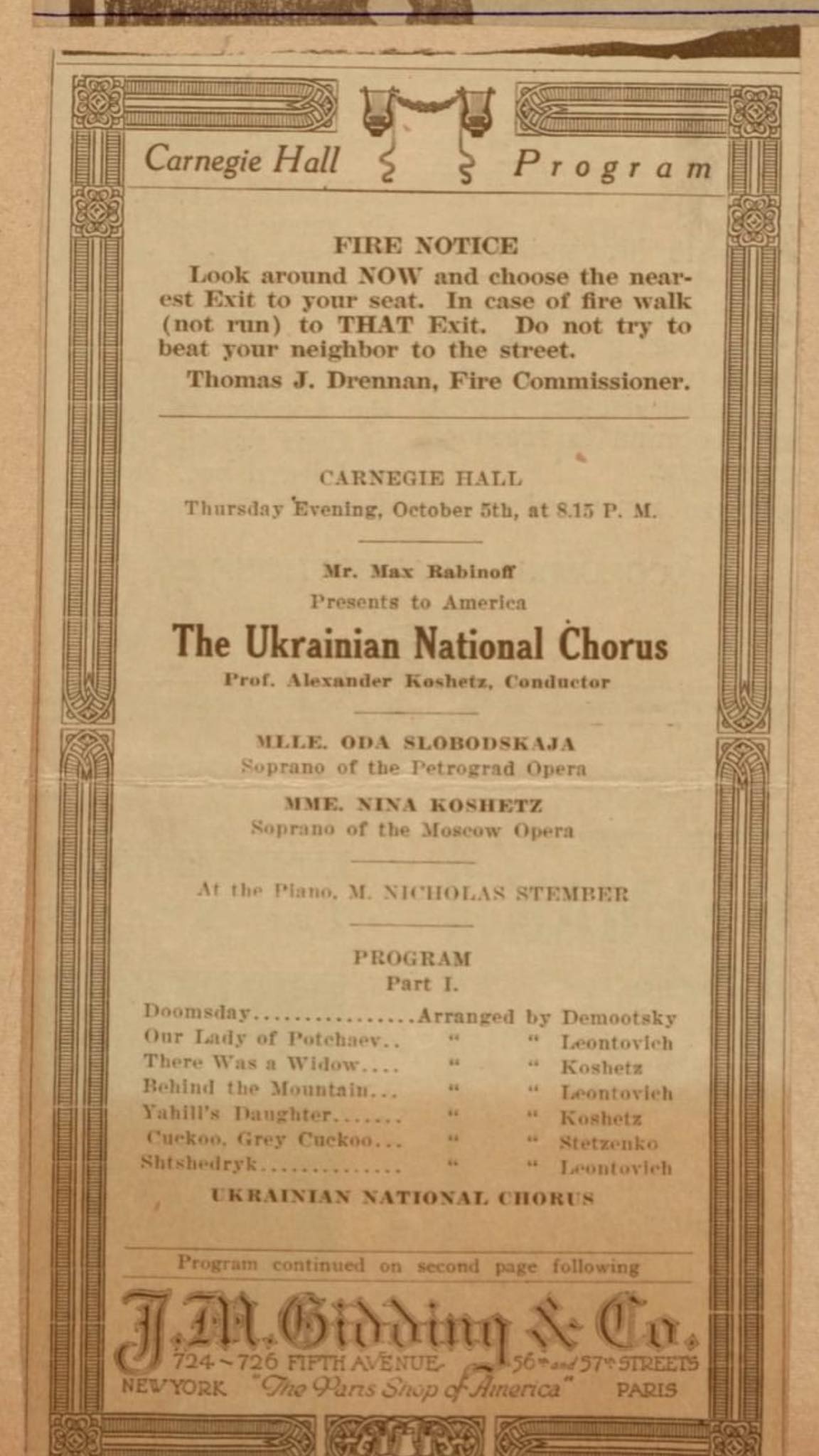 Ну і власне наближаючись до концерту «Notes From Ukraine», останнє, на що хочеться звернути увагу — відмінності у репертуарній політиці культурних амбасадорів тоді і сьогодні. Той самий історичний концерт Капели Олександра Кошиця в Карнегі Гол відбувся вже тоді, коли хор вийшов з-під опіки УНР та став співпрацювати з американським імпресаріо Максом Рабіновим. Відповідно його досвіду роботи з російським балетом й оркестром балалаєчників, кардинально змінилися концертні програми й капели. Як би не було парадоксально, але на афіші виступу тоді вже Української національної капели, окрім хорової музики українських композиторів, можна побачити й сольну музику російських. Виконували — сопрано Петроградської опери Ода Слободская та сопрано Московської опери Ніна Кошиць (племінниця диригента).