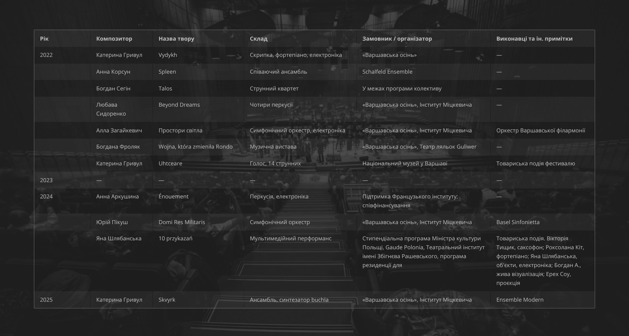 Цьогоріч, 22-24 вересня, завдяки програмі підтримки журналістів від Інституту Адама Міцкевича в Польщі я відвідала фестиваль «Варшавська осінь». Програма одного з концертів у межах події містила музику Катерини Гривул — єдиної української авторки, що представлена на «Осені»-2025.