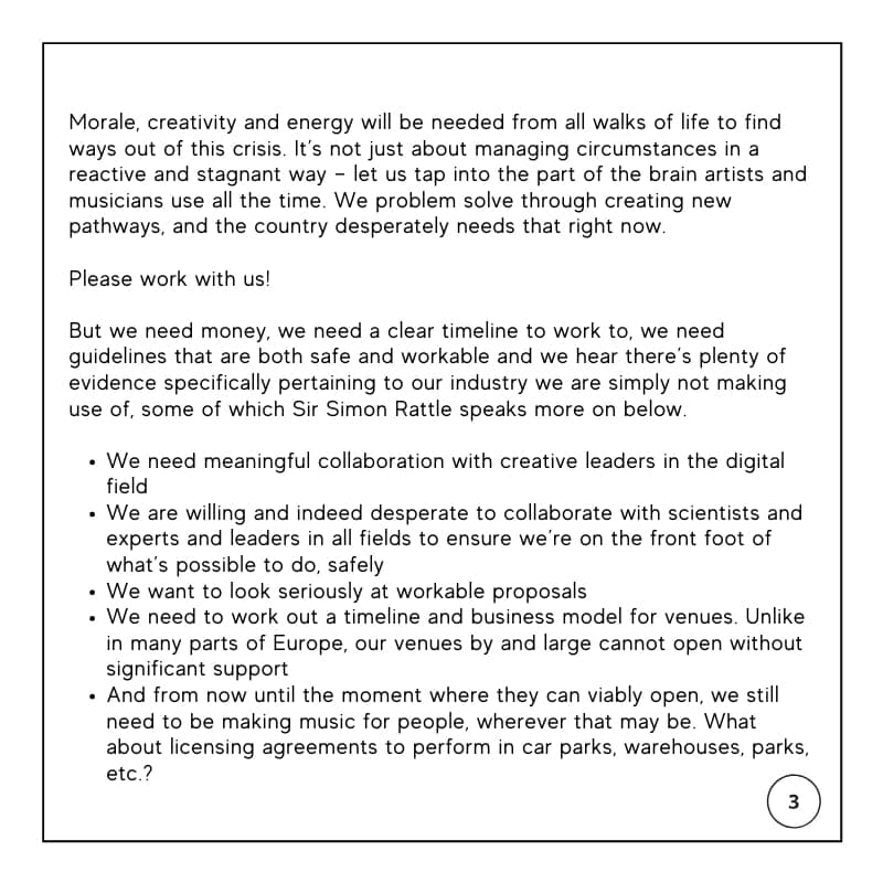У заяві музиканти закликають уряд підтримати індустрію при достатньому фінансуванні. У центрі нещодавніх дискусій стало обмеження примусових заходів дистанціювання і те, як це стане причиною неминучих збитків для концертних залів і оперних театрів.