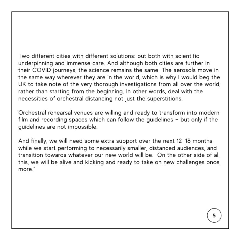 У своїй заяві Саймон Реттл наголосив на своєму досвіді виступів в європейських містах після локдауну, як проводилися заходи по соціальному дистанціюванню і що Великобританія могла б перейняти їхній досвыд.