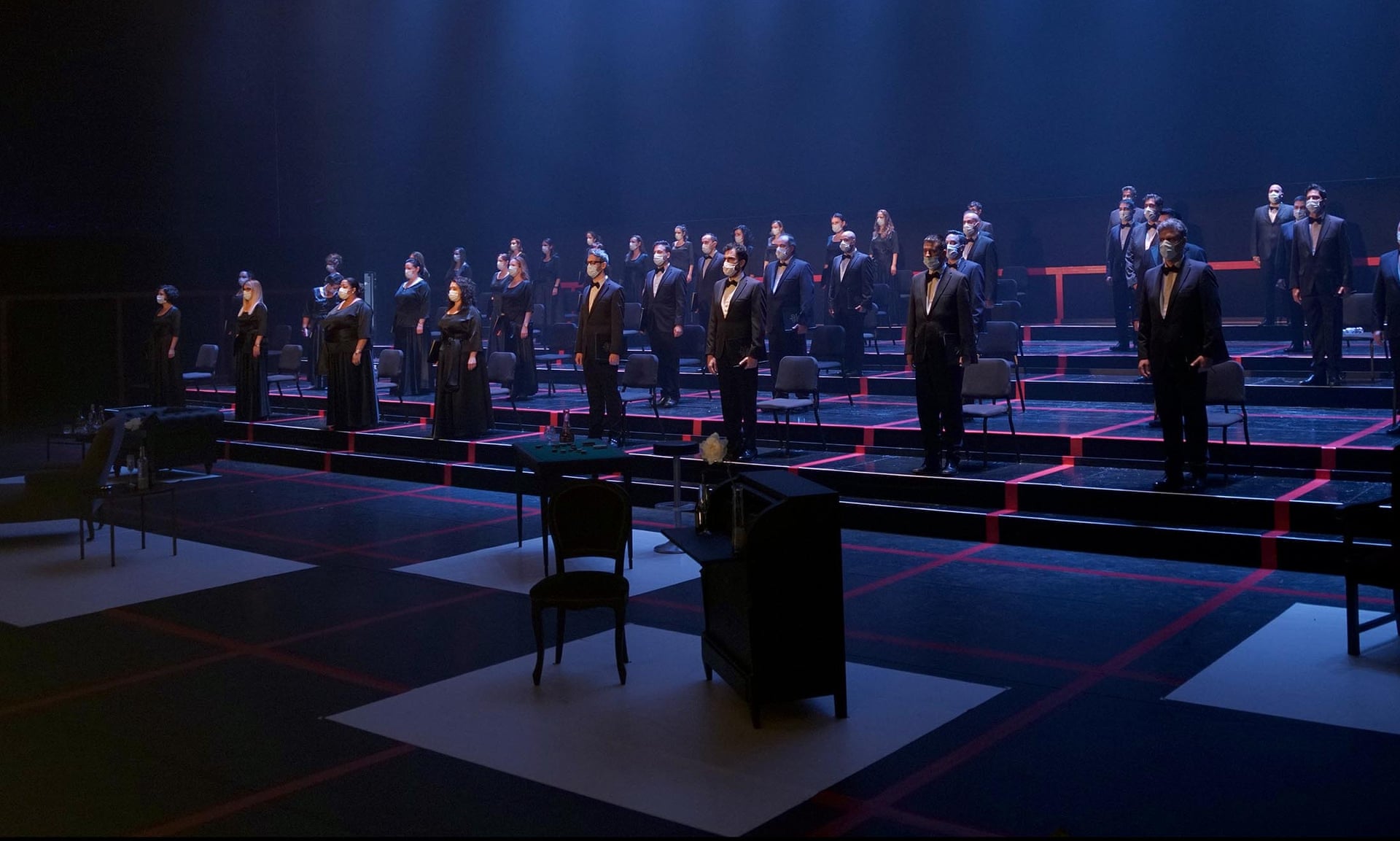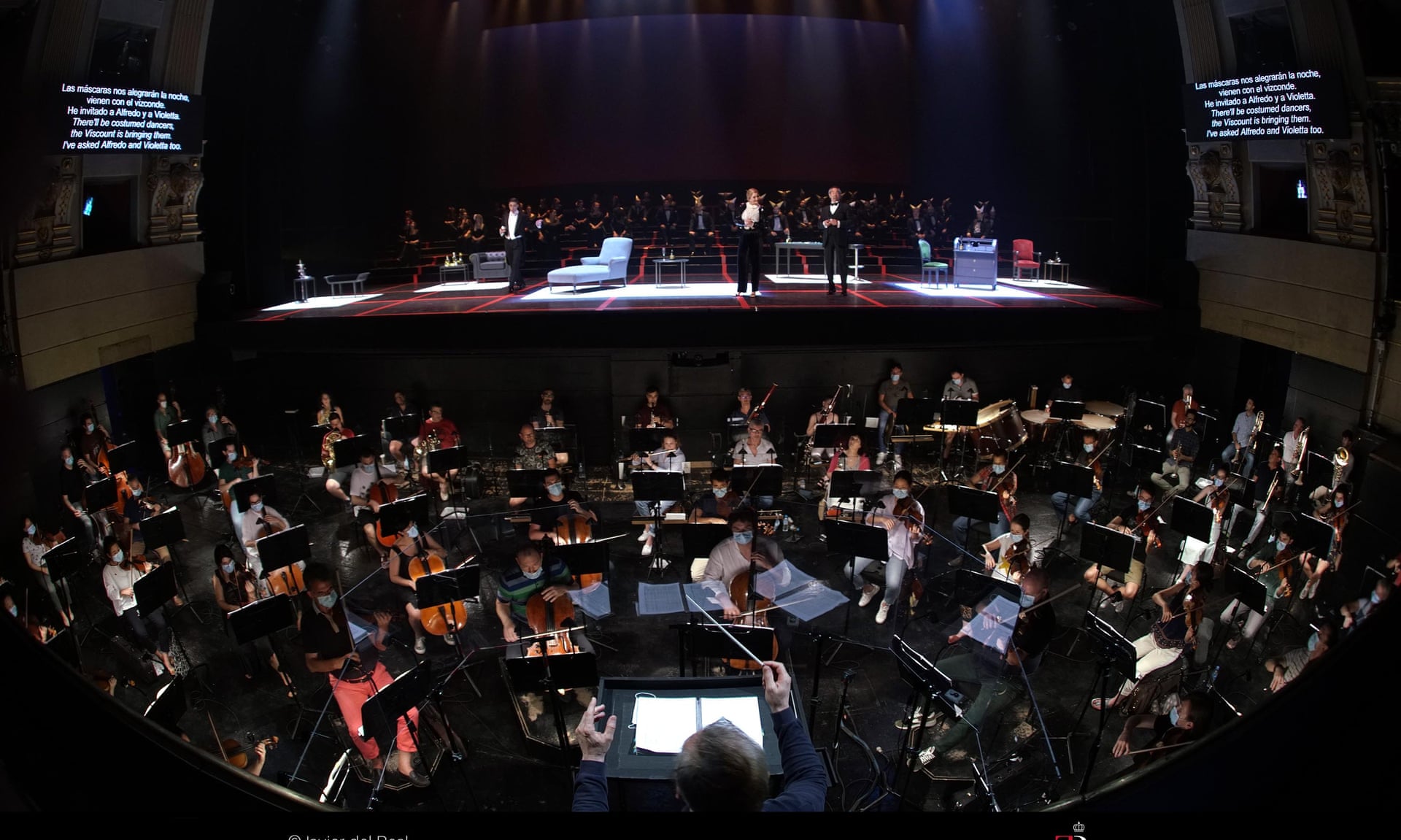 Режисер Лео Кастальді спланував виставу так, щоб між артистами зберігалася відстань в два метри. Таким чином «Травіата» отримала версію без звичних сцен танців і світських вечорів.