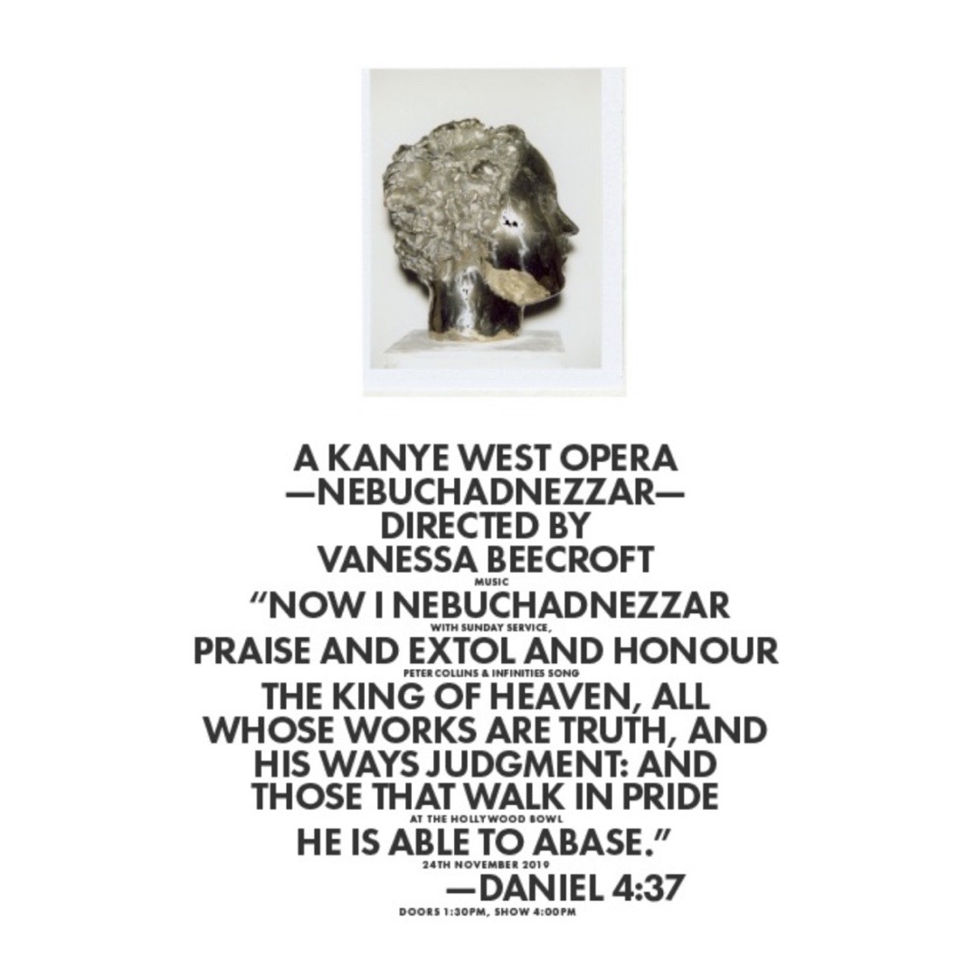 У пресрелізі ж опери Веста зазначено, що «“Навуходоносор” об’єднує елементи з різних світів, включаючи оперу, образотворче мистецтво, сучасний танець та госпел-музику, щоб створити інноваційну перформативну структуру. Голос Веста є мостом між цими формами мистецтва». Щодо «інноваційності перформативної структури» Вест явно погарячкував. Присутність читця, оригінальний біблійний текст, церковний хор, госпельний спів — все вказує на ораторію, і навіть сюжет про перехід царя «від нечестивого, владного, самопроголошеного правителя (як і Вест, котрий проголосив себе Богом, та нечестиво підтримував расиста Трампа, що асоціюється із навуходоносорівським геноцидом євреїв — Л. С.) до справжнього вірянина, який знаходить порятунок у своїй вірі». Тож не можна не погодитись із Вульфом, історія вийшла аж надто автобіографічною: «Він Даниїл, неперевершений оповідач і інтерпретатор, пророк і герой, а також страдний лідер, який знайшов мир у Бозі».