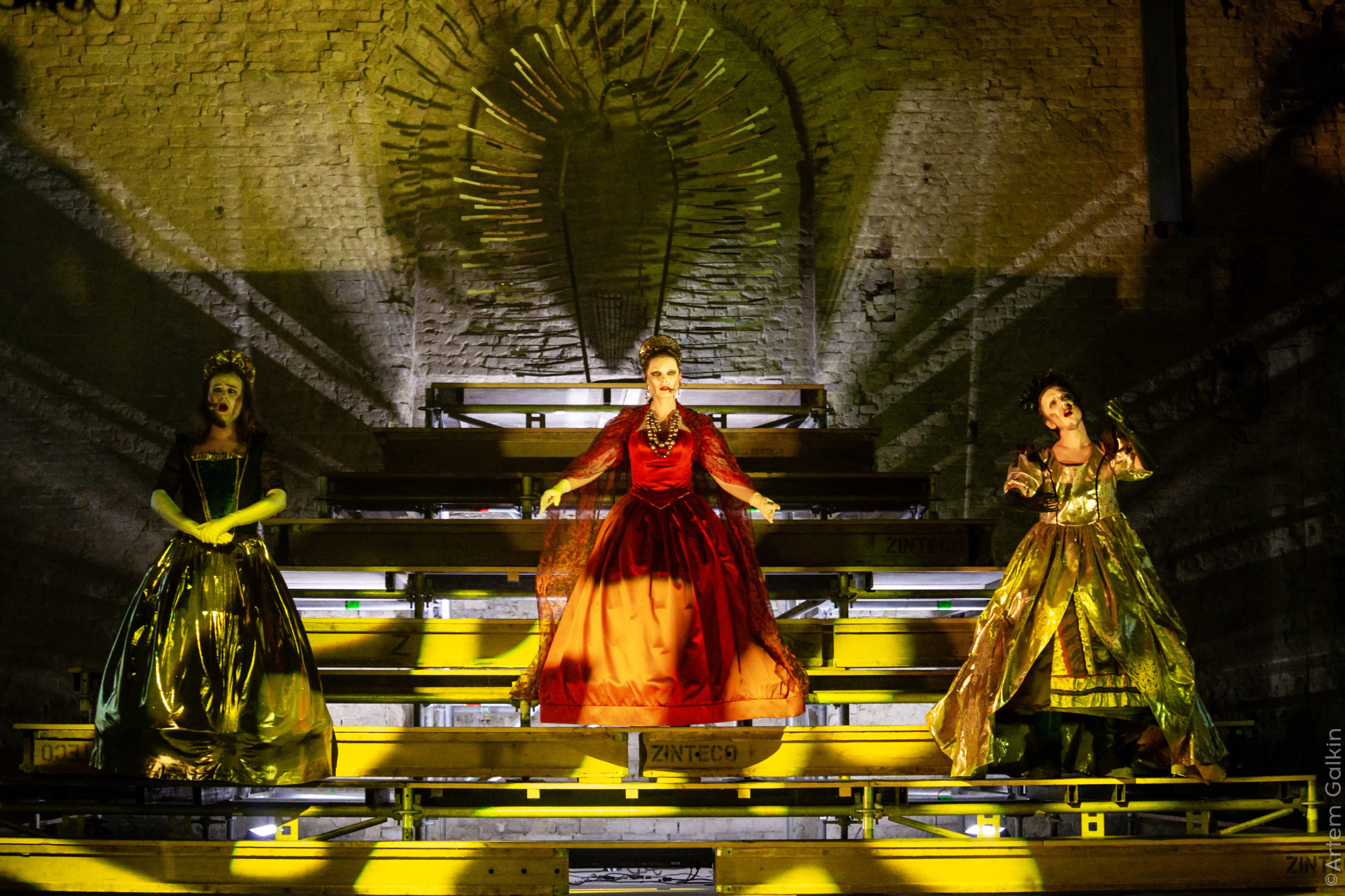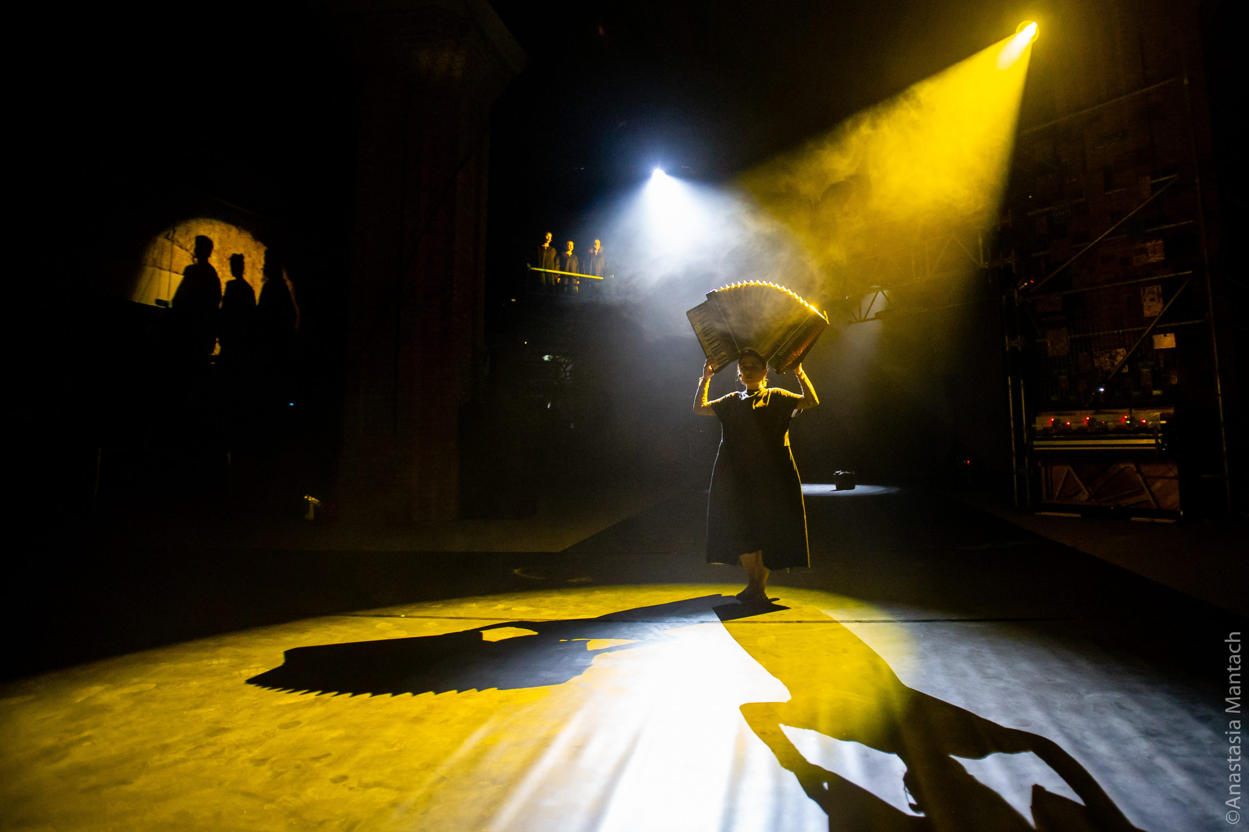 Єдине та важливе «але» щодо організації простору стосується розташування глядацьких місць у локації з чотирма широченними колонами, які не дозволяли спостерігати за усім дійством. Це абсолютно логічні наслідки такого режисерського задуму, однак вони наштовхнули на ненайкращу думку: отже й не обов’язково було все бачити. На жаль, в уяві кожного конкретного глядача утворювалися прогалини, що не могло не дратувати в той момент. Інше питання — чи можливо було в умовах Мистецького Арсеналу зрежисувати простір з ідеальною видимістю в карантинних умовах?.. Зрештою, зокрема я не мала змоги бачити музичний ансамбль. А коли ти не спостерігаєш за виконавцями та їх рухами, уся увага спрямовується на саму музику.