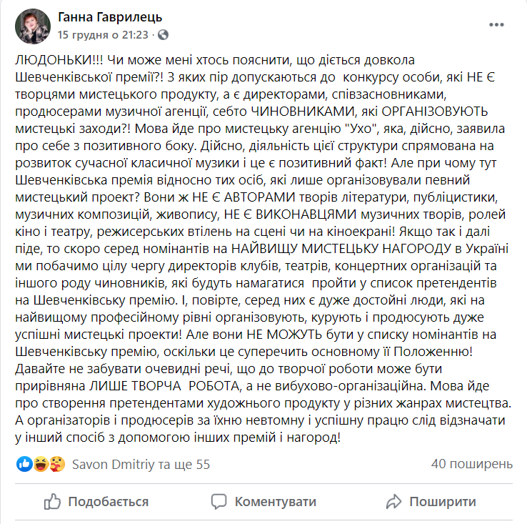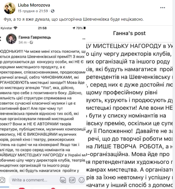В тому вигляді, в якому існує зараз список номінантів на Шевченківську премію-2021 саме в розділі «музичне мистецтво» (і вже другий рік поспіль цей список виглядає дуже дивно на тлі інших, досить насичених та цікавих номінацій) сама ідея «змагання» є дискредитованою. З ким змагатись мегаломанському проєкту «Архітектура голосу»: з квартетом саксофоністів, чи з фортепіанними циклами Олександра Козаренка? За якими критеріями можна взагалі ці проєкти порівнювати?